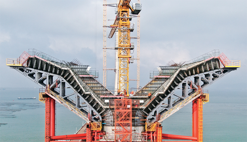 中央企業(yè)把主題教育與貫徹中央重大決策部署結(jié)合起來,切實抓好服務構(gòu)建新發(fā)展格局戰(zhàn)略任務。黃茅??绾Mǖ朗抢^港珠澳大橋、深中通道之后,粵港澳大灣區(qū)又一跨海通道工程,由保利長大承建的黃茅海大橋中塔于2023年4月18日順利封頂。圖為4月17日,工人在黃茅??绾Mǖ傈S茅海大橋進行墩柱基樁建設。 新華社記者 鄧華/攝