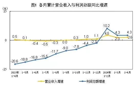4月份,規(guī)模以上工業(yè)企業(yè)實現(xiàn)利潤同比增長4.0%