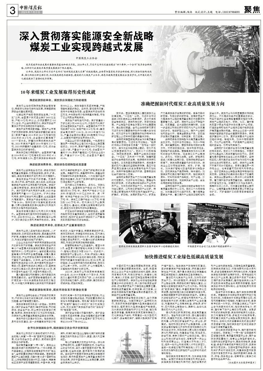 10年來,煤炭行業(yè)牢記習(xí)近平總書記“做好煤炭這篇大文章”的殷殷囑托,全面貫徹落實能源安全新戰(zhàn)略,深化供給側(cè)結(jié)構(gòu)性改革,強化科技創(chuàng)新支撐引領(lǐng),加快煤炭綠色低碳轉(zhuǎn)型,建設(shè)現(xiàn)代化煤炭產(chǎn)業(yè)體系,綠色低碳高質(zhì)量發(fā)展邁出堅實步伐,為中國式現(xiàn)代化建設(shè)提供了堅強的能源保障。